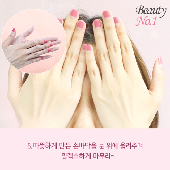 轻轻搓热双手,用掌心包裹眼部,提高眼部问题,促进眼霜的吸收。