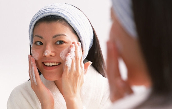 洗脸时,先用温水将洁面用品揉出泡沫,敷于面部,轻柔地按摩1分钟,T形部位着重按摩。彻底冲净泡沫,最后用冷水洗脸。冷水可以增强血液循环,提高皮肤弹性。采用这种温水和冷水交替洗脸的方法,既可清洁面部皮肤,也可使皮肤浅表血管扩张、收缩,有利于面部皮肤的美容保养。