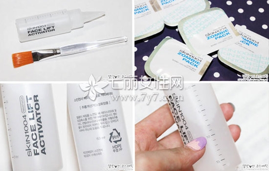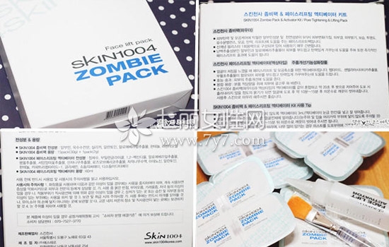 白色包装盒,简单、大方,背面印有产品名、产品说明、产品使用说明、产品容量、成分表,使用前可以仔细阅读一下。此套盒里有僵尸面膜(15盒,30g/盒),面膜起动水一瓶(60ml),和一把面膜刷。