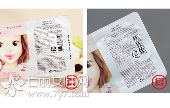 正品的爱丽小屋唇膜的正面包装上可以看到,上面印着很多朦胧的白色波点,而假货的包装上则是十分清晰的,这点只要妹纸们稍微留神就能很轻易的分辨出来。