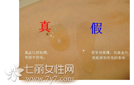 从上图我们可以看到,真的雅诗兰黛小棕瓶精华较为浓稠,滴一滴在手背上,有然后用食指轻轻触碰精华,看看是否能够拉丝,如果可以就证明你这瓶雅诗兰黛精华是真货。假的雅诗兰黛精华质地非常的稀薄。