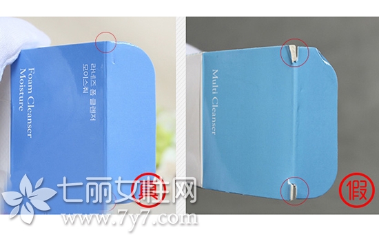 从纸盒封口的工艺来鉴别兰芝洗面奶真假,则是注意细节了。真的兰芝洗面奶和假的兰芝洗面奶在图中标注的位置都有明显的折痕,而真的兰芝洗面奶在标注位置是粘合的,没有任何的切口;而假的兰芝洗面奶在标注的位置有着明显的切割痕迹哦。