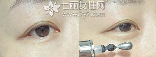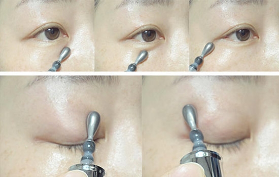 用按摩头蘸取适量眼部精华后,首先涂抹于眼周,然后用按摩头轻轻来回进行按摩,同时不要忘记上眼头、眼睑也要按摩。