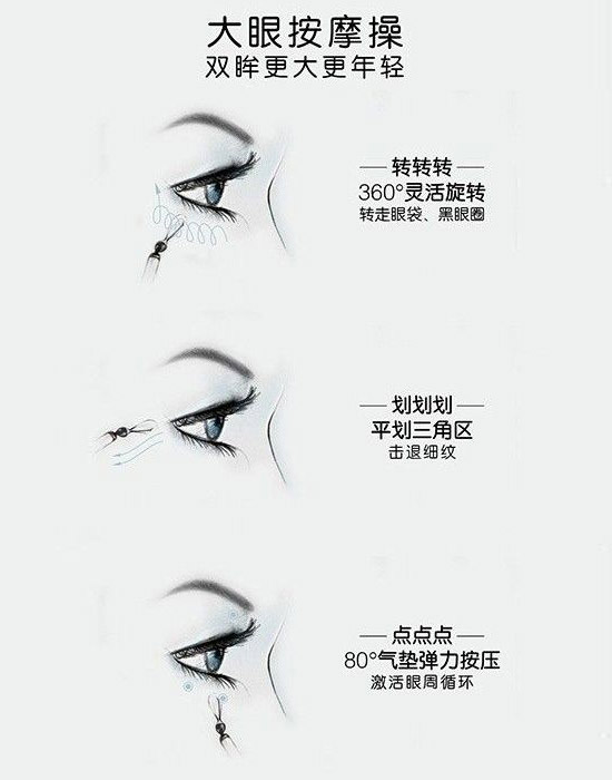 小编提示:这里不建议按摩至全部吸收,太干了,会使眼部肌肤受到拉扯,最后可以使用无名指点弹拍打吸收。