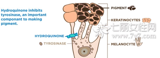 氢醌能通过抑制酪氨酸酶活性,阻碍酪氨酸酶去刺激黑色素形成。同时,氢醌会让黑色素细胞(负责生成黑色素的细胞)凋亡。国际皮肤科杂志在2003年刊登过一篇文献验证氢醌的祛斑效果。文献数据显示,氢醌淡化黄褐斑的有效度高达76.9%,而其他美白混合物淡化黄褐斑的有效度为66.7%。
