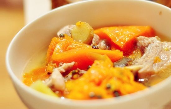 做法:将鲜木瓜洗净去皮除核,并切成粗块件备用。干鲜花生仁用清水洗净杂质,鲜猪排骨用清水洗净血污,砍成粗件,并加用精食盐稍拌匀。然后将上述汤料同放进汤煲内,加进适量清水,先用武火,后用文火煲煮。煮至花生仁熟透变软即可。
