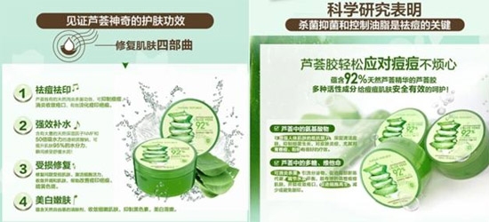 首先,它的成分主要为芦荟,芦荟的功效真是不得了,都是对肌肤非常有好处,调节细胞机能,抵御环境伤害、清洁皮肤,清透毛孔、祛除暗沉、修复受损细胞等等等等,92%的芦荟意味着什么?它的含水量是普通面霜的6倍,补充肌肤营养,让肌肤饱满水润那自然是不在话下。