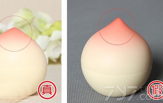 这是瓶盖顶端桃子尖的真假区别,大家注意看,对比下正品与假货水蜜桃的瓶盖顶端就可以发现,假货的桃子头是会比正品的还要高而瘦小。通俗地讲就是假的蜜桃手霜的瓶子比真的要尖些。