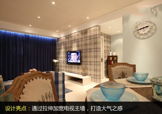 电视墙原本比较窄,显得过于小家子气,采用灰色的格子壁纸,在视觉上增加了宽度,再调和沙发背景墙的蓝色,很有视觉冲击力。