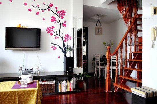 很多家庭的电视背景墙都是以白色为主,单纯的色彩过于单调,如果贴上一款好看的墙贴,粉色的花瓣随风飘落,令整个电视背景墙田园风十足。