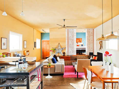 明黄色背景墙可以提亮整个空间的色调,同时也会让人的心情变得明朗起来,开放式的设计很时尚。