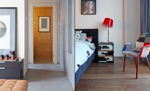墙上的挂画是卧室的点睛之作,无论是在选色上还是风格上都与房间是绝配,黑白色主调的温暖气氛,用亮色系来调整整体的时尚感和独特性,彩色拼布扶手椅也成为了亮点所在。
