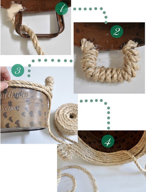 Step 2:在容器的两个把手上都绕上绳子,没绕一圈就上一层胶水。
