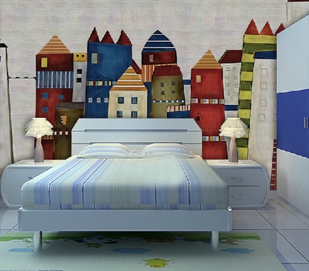 如果是小男孩房间的话这款背景墙是不错的选择,不管是冷色调还是暖色调都可以用。类似于火箭的图案总是能让男孩们的心充满幻想,仿佛能坐上去起飞云霄一样。