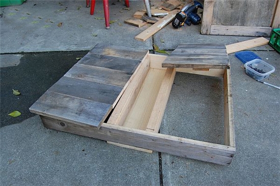 STEP 3:用旧木板量好尺寸,缝制好两边的桌面,用钉枪将其固定。