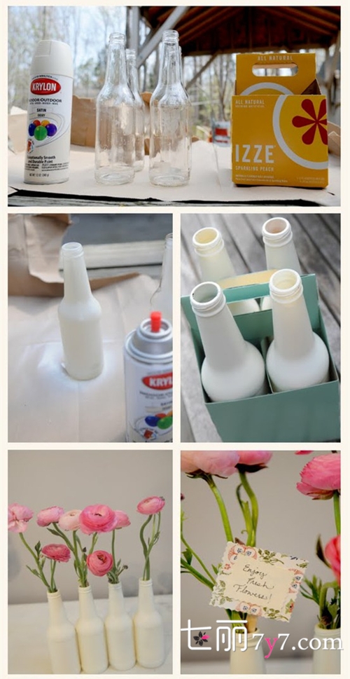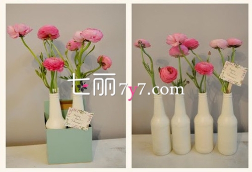 准备材料:纸盒、啤酒瓶4个、喷漆、花朵