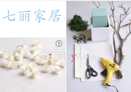 准备材料:纸玫瑰、方形陶瓷容器、树枝、青苔、石头、电胶笔、海绵