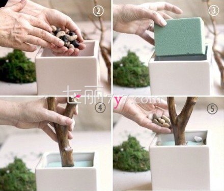 STEP2:把树枝插在海绵中央,然后铺上一层石头。