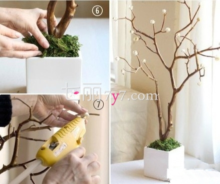 STEP4:用电胶笔将白色的纸玫瑰粘贴上去,这样一个室内植物就完成了!