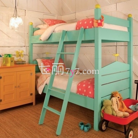 上下铺儿童房设计:薄荷绿的床+可爱的床单,适合女孩子的设计。