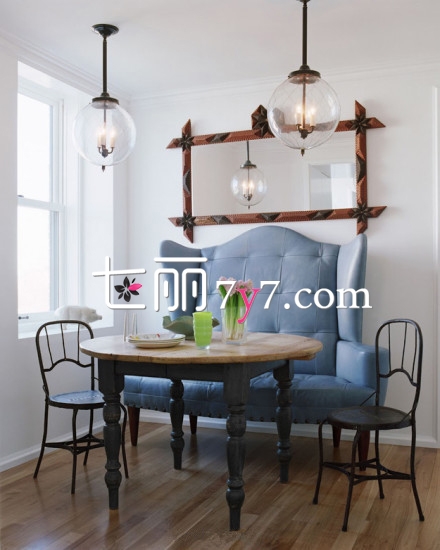 小户型餐厅装修效果图LOOK1:灰蓝色单人沙发+圆桌椅+白色窗台+圆形灯具