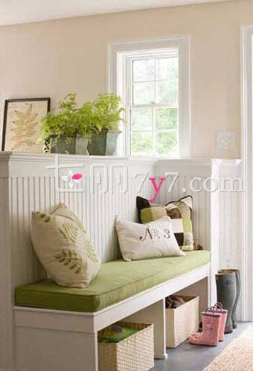 把玄关处多余的空间设计成软榻也是个不错的选择,在下方放一些置物篮,可以把小东西都收纳在其中。更重要的是还可以坐着换鞋,非常的舒适。