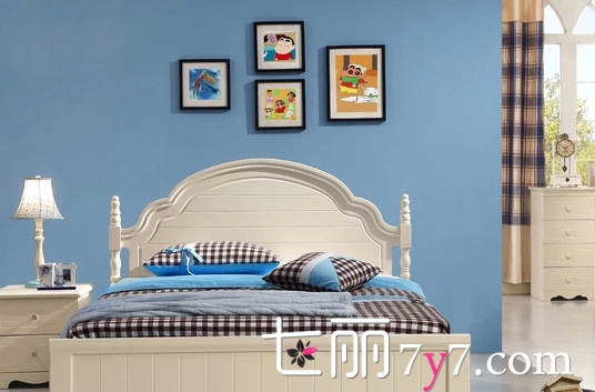 淡淡的蓝色作为主色调,与墙面的碎花交相辉映,呈现出春意盎然的效果。在墙壁上挂几幅卡通画,很适合小男生们!