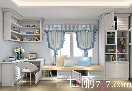 在凹位设计韩式风格的飘窗,搭配出一个转角书桌与转角吊柜,拼搭出一个读书与休闲的小空间。书柜运用平开放的设计方式,使其更具有实用性与美观性。