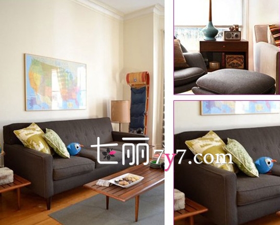 深咖啡色布艺沙发给人一种深沉安逸的感觉,简单的款式和实用的设计,很适合小户型家居,而家居中用白色窗帘和一些具有原木风味的饰物来点缀,凸显出大自然的独特风味,让你在这个夏季感受大自然的无限美好。