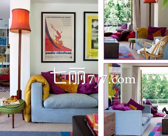 超吸睛的蓝色布艺沙发,给人一种明亮的感觉,而沙发上还存在着紫色和黄色系的沙发靠垫,在沙发的背靠处用的是蓝色和红色的交织色彩所装点,显现出极大的色彩跳跃性,最后墙面的白色衬托出多色系的优美和动人气息。