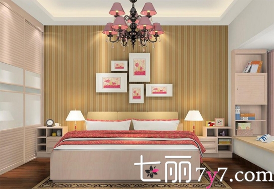 以非实木打造出有质感的实木感觉。黄色条纹壁纸有拉升空间的效果,使得整个空间更温馨舒适。简约大方的设计,再在卧室里添加适量的粉红,瞬间变得温馨和女人味,深受欢迎。
