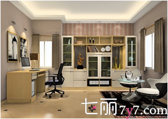 以褐色为主色调搭配黄色的饰品,来点缀整体效果,并相连接的书柜提升了空间的实用收纳性,让整个书房充满浪漫气息。