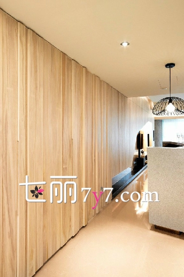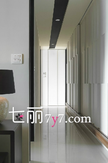 走廊天花板上的灯槽一直从玄关延伸到卫浴,将整个空间串联起来。造型墙面的设计,其实是和室的门片,这样的立体墙面纹路,让整个走廊的时尚感十分丰富。
