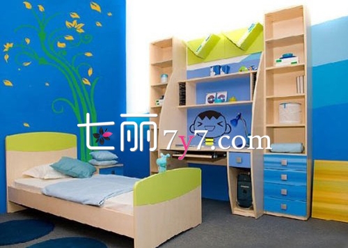 小孩子天生就喜欢五颜六色的色彩,如果将多种色彩运用到他们的房间里那么再适合不过,这款儿童房以蓝色系为基本色系,再融入了绿色和黄色色系,极大限度的丰富了房间色彩,让儿童房显得更加具有童趣。