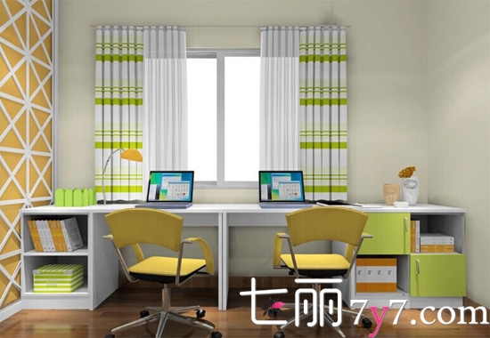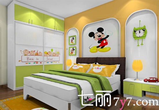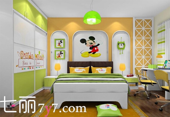 绿色给人一种健康的感觉加入孩纸们的卧室是最好不过的了。喷绘设计和床头背景墙加入孩子们喜欢的卡通人物,增添了不少童趣。到顶衣柜的设计增加了储物功能,并使空间更加规整。鲜亮的色调,让孩子们爱不释手。