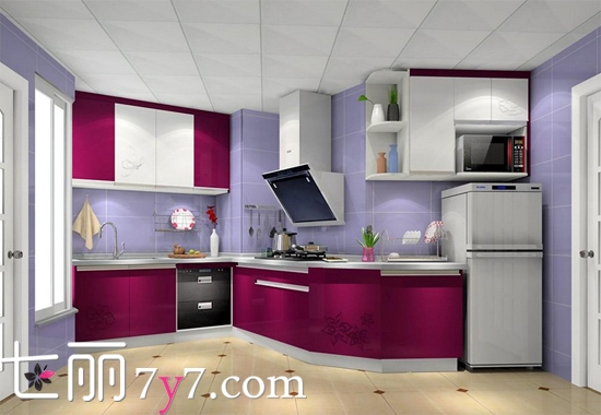 厨房采用高贵典雅的紫色,使空间更具有柔美的女性气质。门板表面加入不同大小形状的印花,线条简洁时尚。透着浪漫简洁的小情调。优雅气质白色吊柜增加了收纳储物的空间,让厨房看起来宽敞大气。