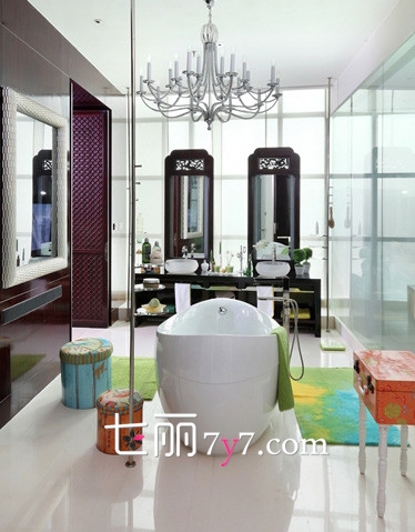装饰TIPS浴缸不偏不倚坐落在正中央,宣誓着女人霸权,两面梳妆镜,增置奢华感。地毯的用色、浴缸两边的收纳厢,透露出女人的小俏皮。