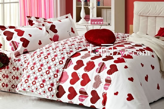 大红色、暗红色、粉红色组合而成的充满小清新的床上用品,纯白的底色又给人舒适、怡然的感觉,瞬间就能抓住人的视线,协和的色彩也能给主人带来视觉享受哦!