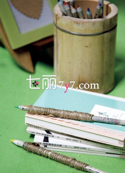 取适中长度的麻绳围绕彩色铅笔进行包裹即可,完成之后是不是非常清新自然呢?麻绳粗糙的质感,起到了防滑的作用,使铅笔更加运用自如。