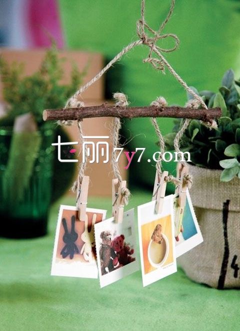 选一根中指粗细较直的木棍,量好距离在木棍上打4个小孔,将麻绳穿过去,用小木夹固定在绳子的另一端,夹上一些自己喜欢的生活照悬挂在半空中,营造出温馨唯美的景象。