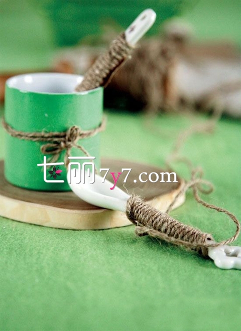 用较细的麻绳紧紧有序的缠绕在简约的白色勺子和绿色杯子上,触感粗糙的麻绳令杯子和勺子更具质感,扎上一个可爱俏皮的蝴蝶结,画面唯美清新。