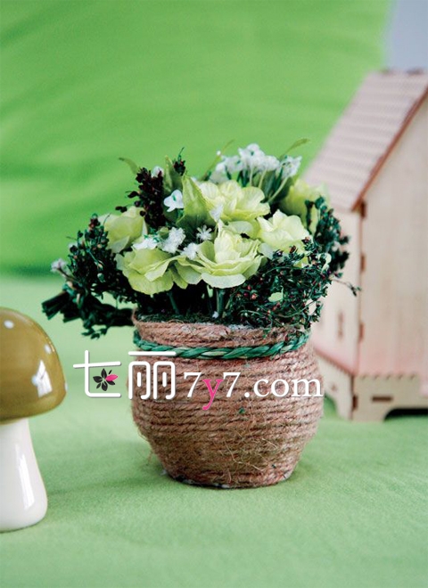 废弃的小花器可以改造成别样风情哦,用一些麻绳进行简单的捆绑并粘贴在花器周围,既能掩盖了花器本身破旧的面貌,呈现出极具自然气息的景象。