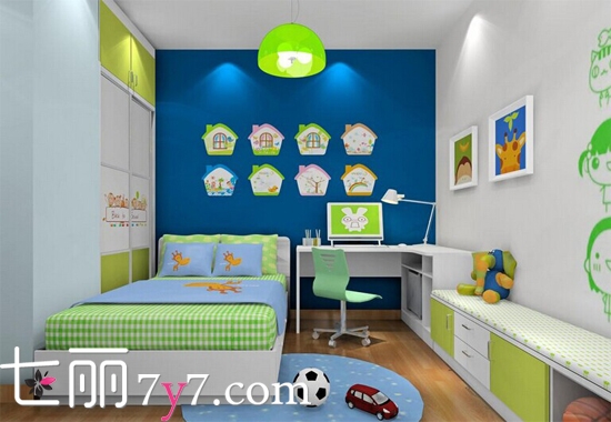 蓝色与绿色的碰撞呈现清新气息。简约纯白色书桌搭配着荧光绿的椅子。趟门衣柜的摆设节省了不少空间,增加了空间利用率。蓝色快乐星球,带给他更多的想象空间,有助于创造更丰富的学习思维。