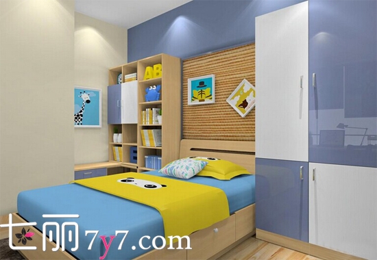 以蓝色为主色调,搭配黄色凸显男孩的活泼与理性,转角矮柜与书柜的结合,使空间更显规整。为孩子打造一个自由快乐的小天地,这款设计再适合不过!