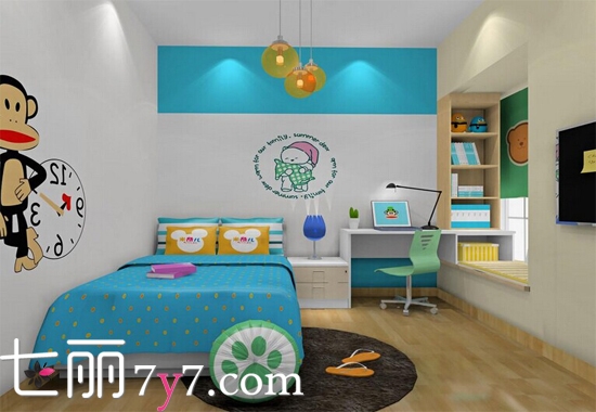 大嘴猴是很多孩子都喜欢的卡通人物,它的加入给房间增添了不少童趣,飘窗中镶入书桌与书柜的设计,既不影响光照,又大大的节省了空间。这是非常棒的想法。蓝色空间,休闲娱乐一体化。孩子的欢乐天地。
