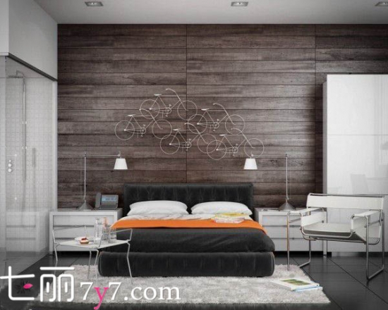 空间点评:以复古深色木质墙面作为卧室背景墙,让这间卧室整体看上去美观大方且不失实用性,地面则以最简约的方形瓷砖组成,与双人床色系相似的地面,整体感很统一。宽宽的白色床头柜看上去能够利用它收纳下不少小物件。双人床一旁的透明玻璃代替了卫生间的墙面,使空间明亮度提升了不少。
