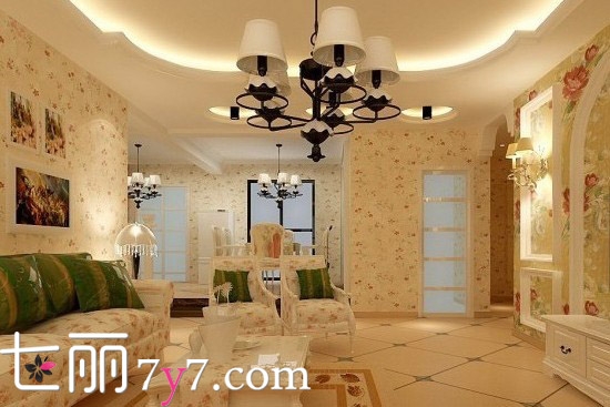非常清新的碎花壁纸,配上温暖色系的灯光,暖到人心,仿佛将带入了春暖花开的田园间。黑白的铁艺吊灯,搭配得非常精彩。优美的客厅线条在金黄色的灯光渲染下更具大方。