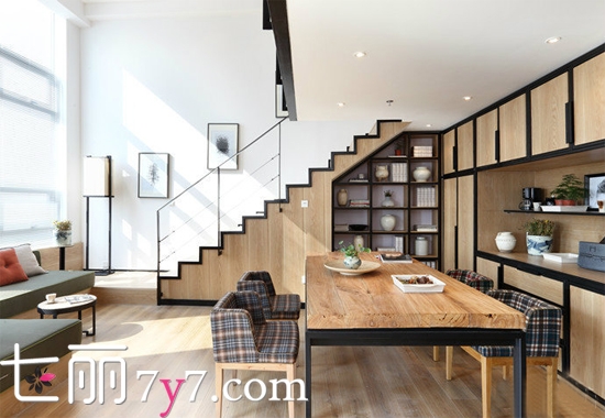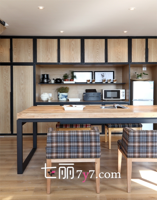 原木的家居别落有致,色彩采用原木色与黑色修边的设计,彰显居住者热爱自然,享受悠然惬意的生活。家里温暖的木质家具让整颗心幸福安定。大大的餐桌可以呼朋唤友来场单身大派对。