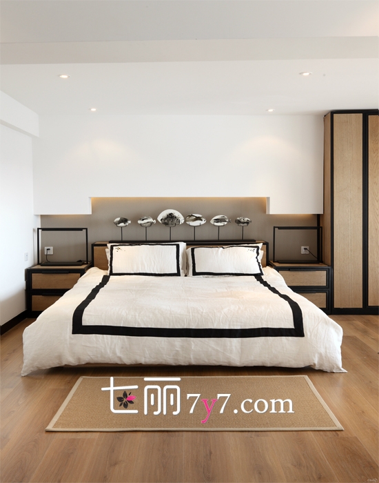 透过二楼玻璃看到卧室的大床。属于自己的卧室,充满一个人的自由与洒脱。一个人在床上可以随意地翻滚。沉稳的米白和灰色带来了无限踏实与安全感。