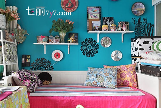 家居搭配:印花图案的抱枕尽显少女本色,卧室里的用色搭配也非常丰富,青春活力十足,沙发床上的碎花抱枕显的格外活泼、俏皮。